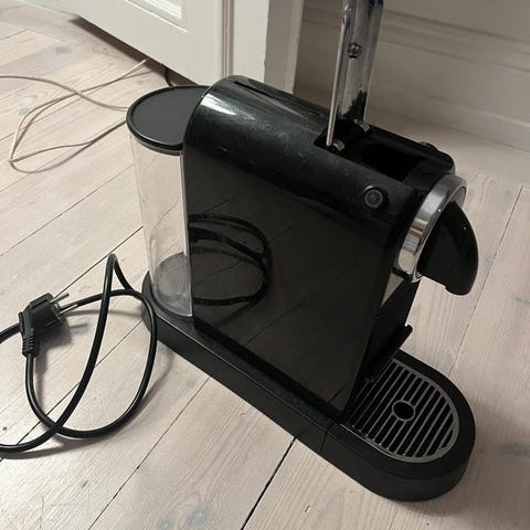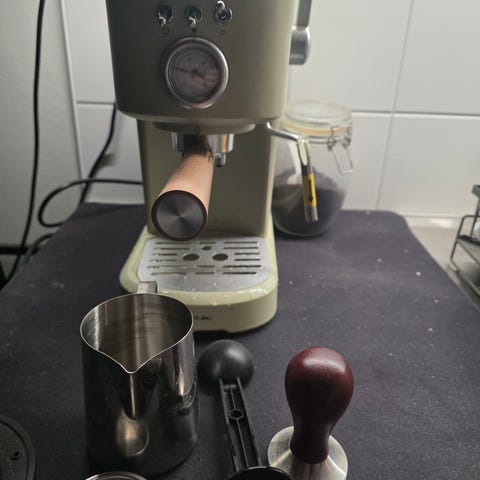 This is a practical, tiny, chic espresso machine, brewing espresso with ground coffee.