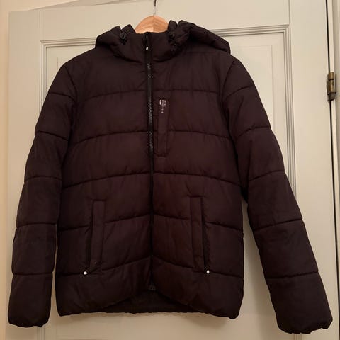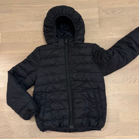 Lättviktsjacka i storlek 152, svart färg och relativt smal unisexmodell. Jackan är vadderad och har en huva.