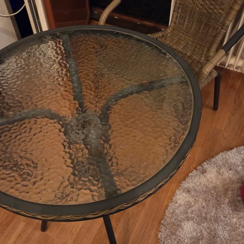 Cafebord i bra skick med två stolar Benen är nedmonterade för enklare stransport.
