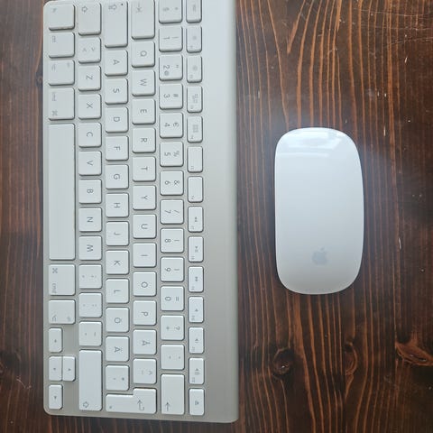 Apple trådlöst tangentbord och mus i vitt. Tangentbordet har ett kompakt och slimmat utförande med låg profil. Musen är ergonomiskt utformad för användning med olika datorer och har en slät yta. Produkten är trådlös och avsedd för användning med kompatibla Apple-enheter.