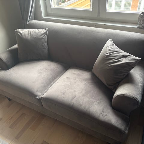 Säljer hela paketet tillsammans: två 3-sitssoffor och en 1-sitssoffa i mjuk lila sammet med matchande grå prydnadskuddar. Perfekt för vardagsrum eller loungehörna.