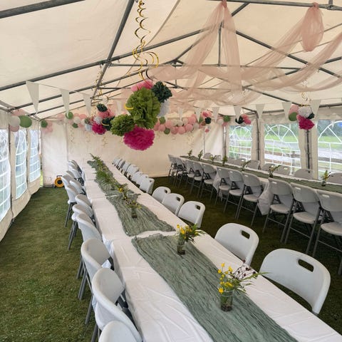 Partytent med måtten 3x4 meter, utrustad med fyra väggar i blå färg.