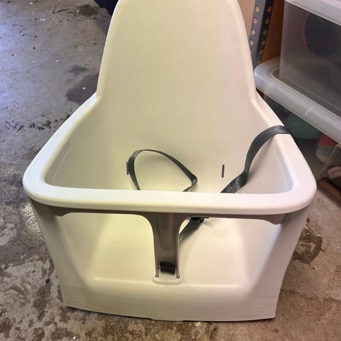 Barnstol i plast och metall med ljus färg. Barnstolen är utformad för små barn och har en enkel och funktionell design.