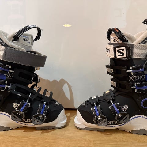 Salomon QST Access 70 T skidpjäxor i färgerna gråblå och svart. Skidpjäxorna har tre spännen för justering och är designade för att ge stöd och komfort vid skidåkning.