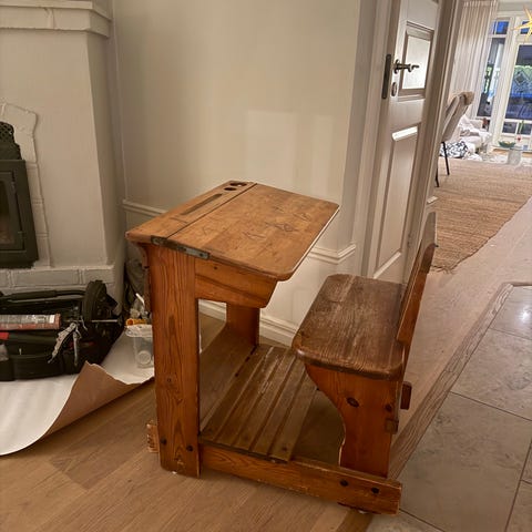 Äldre skolbänk i bra skick. Finns färgskav och lite färg från kritor annars inget att anmärka.