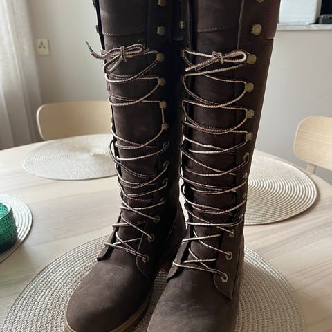 Timberland stövlar , storlek 39 i brunt skinn. Stövlarna har snörning fram och dragkedja på sidan för enklare påtagning.