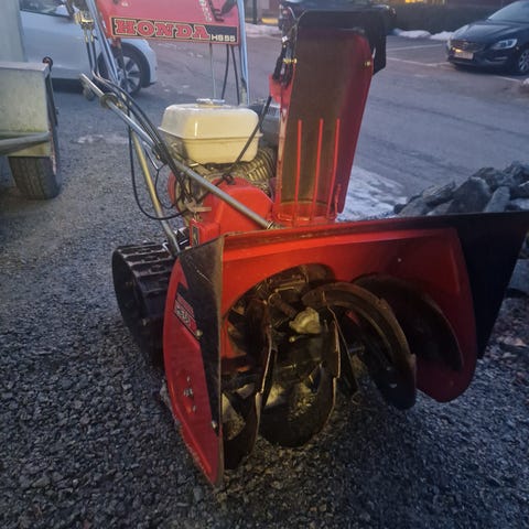 Mtd snöslunga med röda och svarta detaljer. Utrustad med handtag för manövrering och hjul för förflyttning. Designad för att underlätta borttagning av snö från ytor. Bvsa