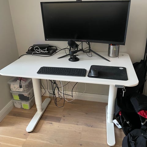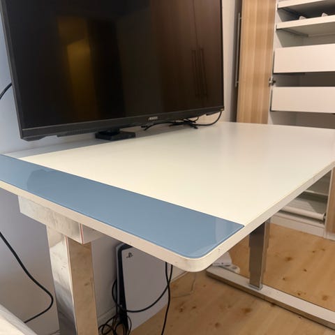 Ett elektriskt höj- och sänkbart skriv bord med hållare till elkablar finns på undersidan. Toppskivan är vit med svarta kanter. Endast använt i ett par månader. Hämtas i Bromma.