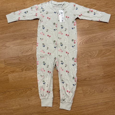 Lindex unisex barnpyjamas i storlek 86, gul färg och tillverkad i bomull. Pyjamasen har ett blommönster och är utrustad med en tvåvägsdragkedja för enklare på- och avklädning.