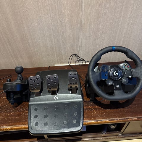 Logitech G29 Racing Wheel med pedalset för Xbox. Ratten är klädd i läder och har flera knappar för spelkontroll. Pedalsetet innehåller tre pedaler i metall och plast. Ansluts med kablar för användning med Xbox-konsol.