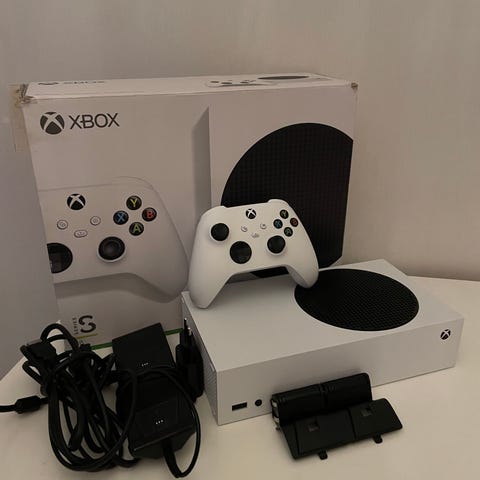 Xbox Series S spelkonsol med 512 GB SSD-lagring i vit färg. Konsolen är designad för att erbjuda snabb laddning och smidig spelupplevelse med modern hårdvara. Passar för användning med Xbox-spel och tillbehör.