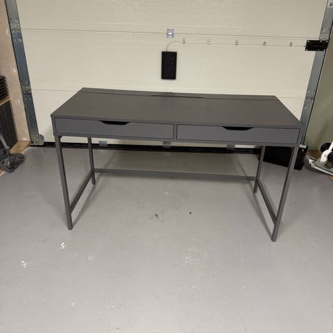 skrivbord i vit färg. Skrivbordet har en enkel design med en låda och ett runt hål för kabelhantering.