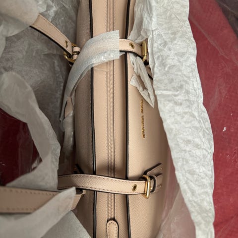 Michael Kors handväska i läder, rosa färg, designad för kvinnor. Väskan har handtag och axelrem för olika bäralternativ. Insidan är fodrad med ett mönstrat tyg och innehåller en innerficka med dragkedja för förvaring av mindre föremål.