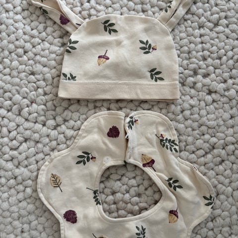 Jättefin stickad mössa med groddekoration, använd endast en gång.