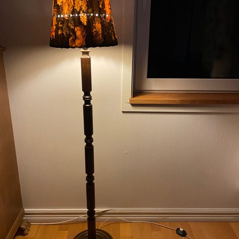 Golvlampa i mässing med justerbar arm. Lampan har en rund fot och en skärm som kan riktas för att styra ljuset. Passar för användning i vardagsrum, kontor eller läshörna.