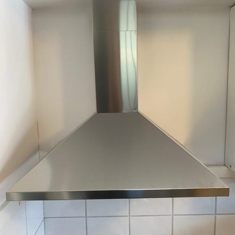 Fläktkåpa i rostfritt stål. Produkten är avsedd för användning i kök för ventilation och borttagning av matos. Materialet är rostfritt stål vilket bidrar till hållbarhet och enkel rengöring.