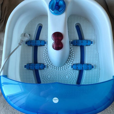 Remote controlled foot bath with massage rollers, bubbles and heating. Lightly used, folds compact.
