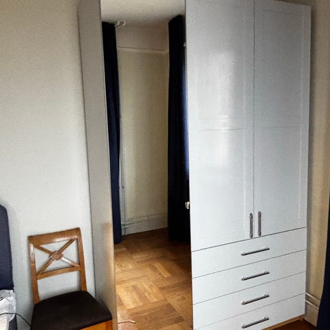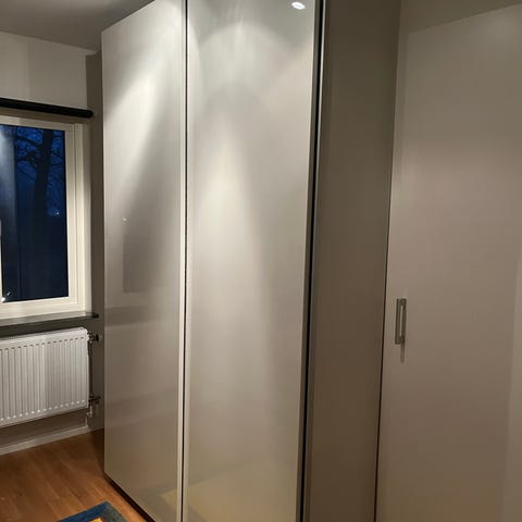 Pax garderob vit med spegeldörrar. Inredd med hyllplan och utdragbara meshlådor.