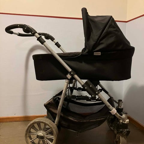 Brio barnvagn, sittdel och två nästan oanvända liggdelar i brunt och turkost. Underredet är väl använd men fyller sin funktion. Lufthjul.
