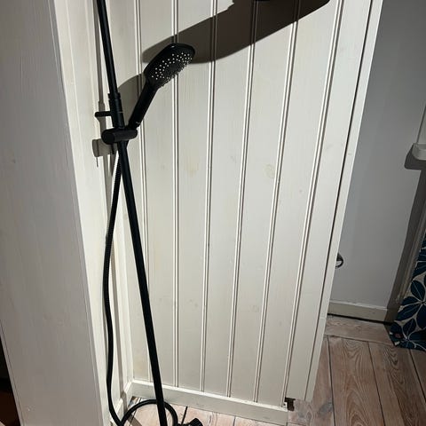 Duschset med kromfinish inklusive duschstång, handdusch, slang och blandare. Passar för badrum med standardmontering.