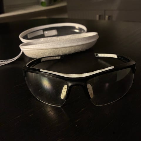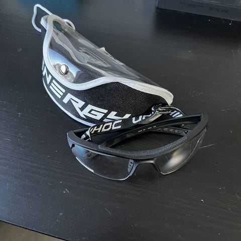 Unihoc SR1 sportglasögon med svart ram och klara linser, senior storlek. Glasögonen är utformade för skydd och komfort vid sportaktiviteter och har justerbart band för säker passform. Fodral ingår.