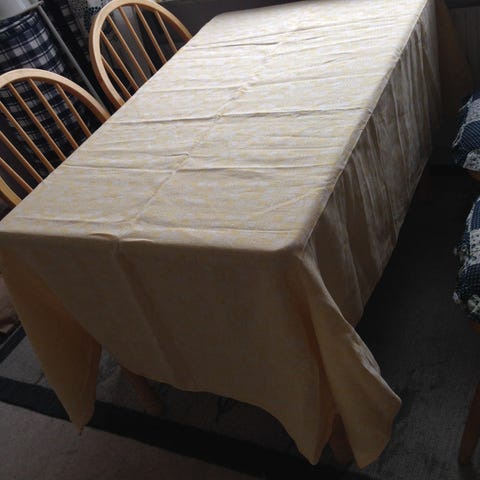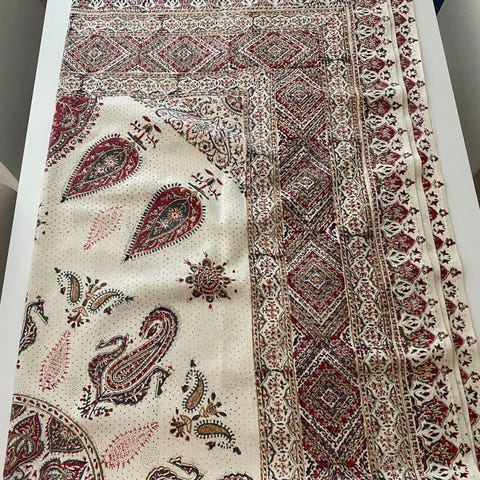 Tyg i bomull med broderier i silke. Duken aldrig tvättad.