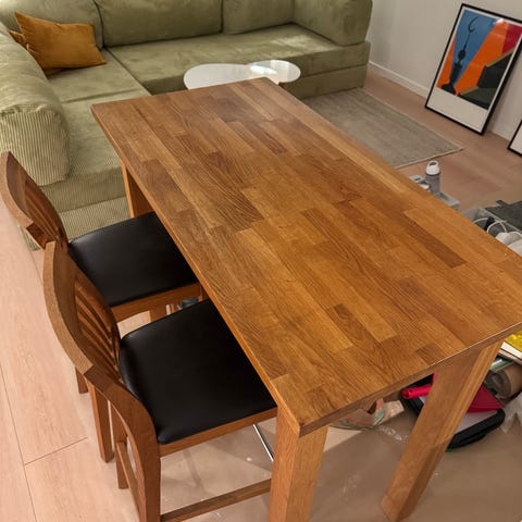 Ekbord med 6 st skinnstolar med ekben . Måttbeställt från okänd designer. Bordet behöver lite kärlek och har en fläck som går att slipa bort. Tilläggsskiva finns med måttet 60 cm. Total längd på bordet med iläggsskiva 220 cm