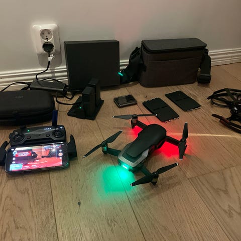 DJI Mavic Air drönare, vit färg. Knappt använt, har aldrig kraschat och är i nyskick. Inkluderar fjärrkontroll, NB: 2 batterier, extra propeller, snabbladdare, kablar, ett 32GB SanDisk Extreme microSD-kort och utprintad manual. Drönaren är kompakt och lätt att transportera med medföljande väska.