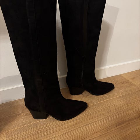 Klassiska svarta knähöga stövlar i äkta skinn / läder / mocka från EXIT i storlek 39. Supermjuka och sköna. Mycket gott skick!!