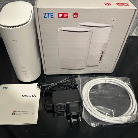 ZTE Router i vit färg. Produkten inkluderar strömadapter och nätverkskabel. Används för att ansluta till och hantera ett datornätverk.