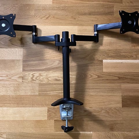 Övriga datortillbehör dubbelt skärmfäste för montering av två skärmar. Tillverkad i svart material och utformad för att fästa på skrivbord. Kan användas för att organisera och effektivisera arbetsytan vid datoranvändning.