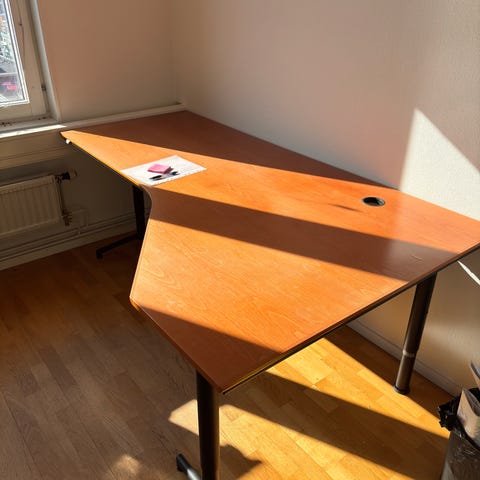 Skrivbord med ekmönstrad skiva. 200 cm brett, 120 cm djupt på djupa delen, 80 cm på smala delen. Justerbar höjd.