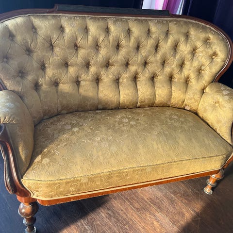 Fjädrarna behöver fixas om det ska gå att sitta i den. Tyget är fint så fungerar som prydnad som den är.
