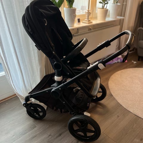 Svart vagn i bra skick, använd för ett barn, inköpt 2020. Vid snabb o bra affär kan man köpa till en sulky för 250kr.