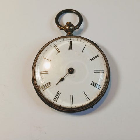 Swiss 18 kr Guld ca 25 gr fickur Klockan har en vit urtavla med romerska siffror och ett fodral med guldfärgad finish. Fodralet har en dekorativ emblem på baksidan. Fickuret är av klassisk design och har en kedja för att fästa i kläder eller ficka.