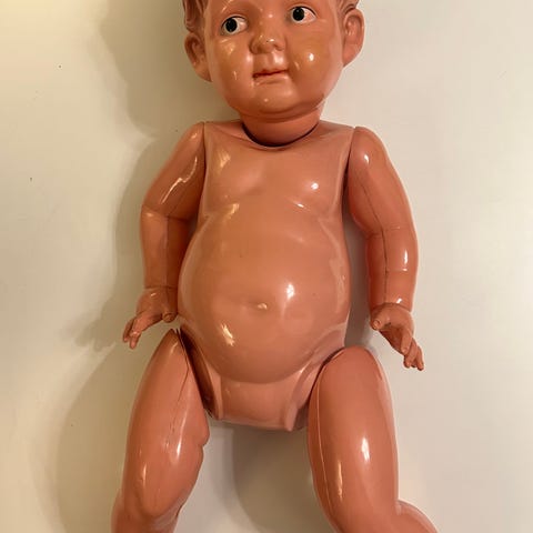 Vintage Docka klädd i vinrött och mönstrat tyg med detaljer i guld och knappar fram. Klänning och jacka med dekorativa band och spets. Dockan är placerad i en gul orginallåda.