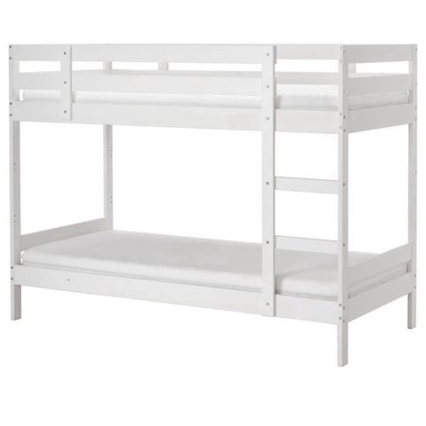 IKEA Våningssängar barnmöbel i vit färg tillverkad i trä. Sängen är designad för barn och har en robust konstruktion med skyddsräcken på övre våningen och en stege för åtkomst. Passar för två barn att sova samtidigt och är lämplig för barnrum.