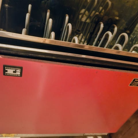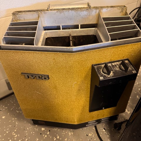 Bastuaggregat med träpanel och styrpanel. Aggregatet är monterat i bastu med träbänkar och träväggar. Styrpanelen har vred för temperaturinställning och kontrollfunktioner. Aggregatet har en skyddande trägrind runt värmeelementet.