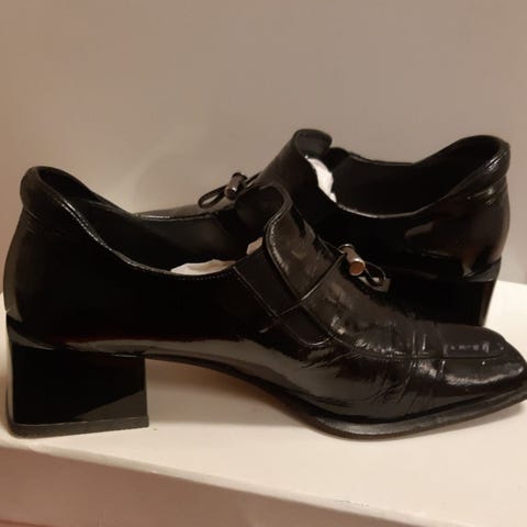Sko Uno 80-tal. Finskor i mocka storlek 44 med svart färg. Skorna har en dekorativ detalj framtill och är avsedda för formella tillfällen.