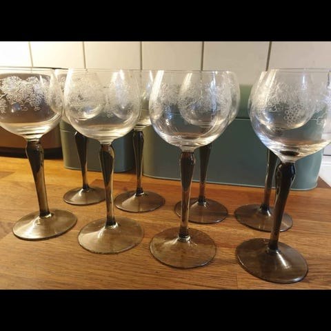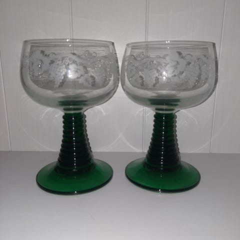 5 st "remmare" vinglas med grön räfflad fot och etsade vinrankor runt kupan.