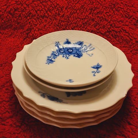 Royal Copenhagen kopp och fat i porslin. Setet består av 4 koppar, 4 fat och 4 små talriker diam 14,5 cm med klassiskt blått mönster på vit bakgrund.