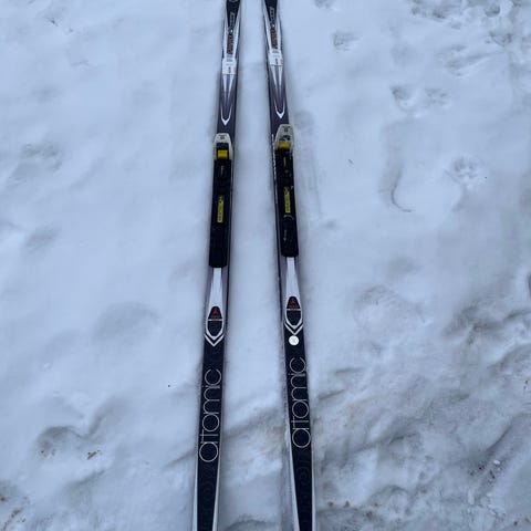 Skidor och pjäxor för längdskidåkning. Skidorna är från Atomic med bindningar från Salomon. 191 cm lång. Pjäxorna är vita med svart och grå detaljer, utrustade med snörning och dragkedja för justering. Från Salomon och storlek 37 1/3.