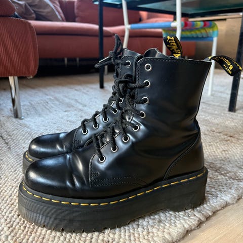 Dr. Martens stövlar i storlek 40 med svart färg. Skorna är tillverkade i läder och har snörning framtill. Stövlarna har en robust sula med gul söm runtom. Passar för vardagligt bruk.