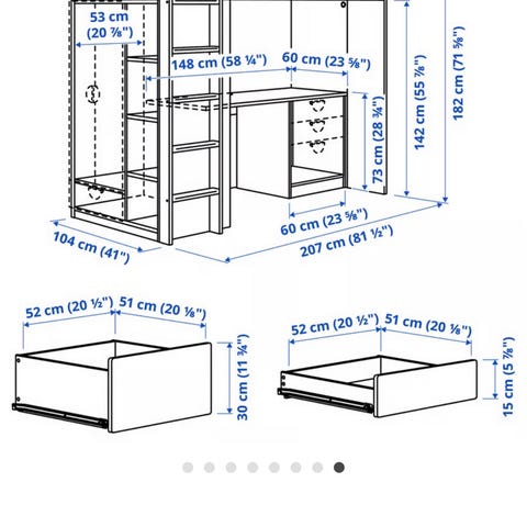 Sängen är cirka 1 år gammal. Medföljer en klädstång till garderoben om man önskar ha det istället för hyllplan.
