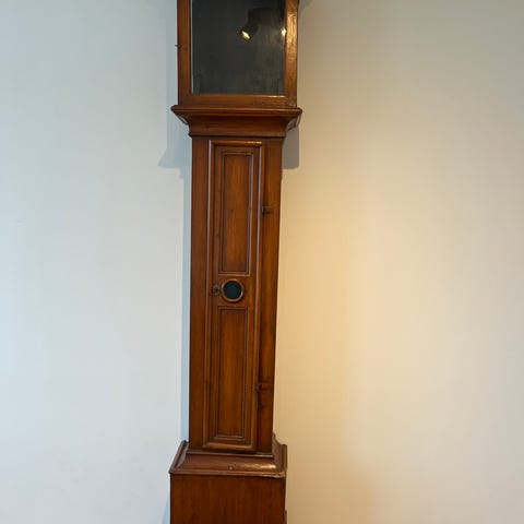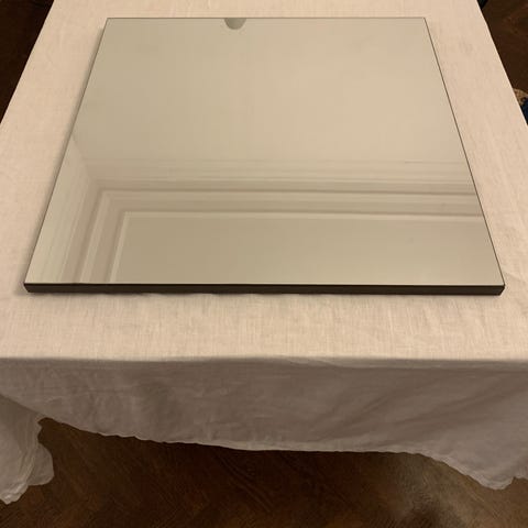 Den är väldigt tung (är en spegel fastlimmad på mdf, f.d. Badrumsspegel). Den har en hemgjord svart träram runt och tyvärr en spricka i nederkant - den kreativa kan nog hitta bra sätt att täcka den om man vill! Vi försökte med en fönstervinyl men lyckades inte så bra då den var halvtransparent. Denna vinyl går såklart att ta