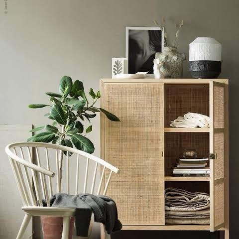 Vackert skåp klätt med rotting. Dörrpar med handtag i mässing. Stomme i ask.