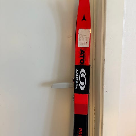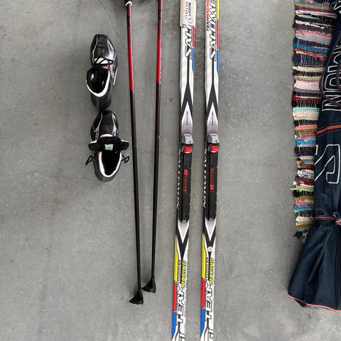 Uppdaterat: nu är skidorna i 145 cm längd kvar, det är utan skin dvs kräver fästvallning. Stavar och det längre paret är sålt.