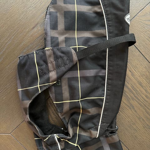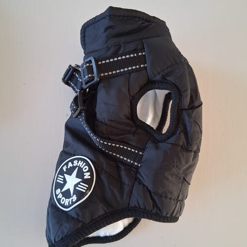 2 Hundtäcken i svart färg. Täckena har justerbara remmar och öppningar för benen. Materialet är slitstarkt och anpassat för hundar. Ett täcke för en mindre hund, det andra för en mellanstor hund