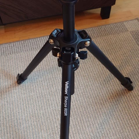 Velbon CX 300 stativ med justerbara ben. Tillverkat i lättmetall, lämpligt för fotografering och videoinspelning. Maxhöjd ca 145 cm, minimihöjd ca 45 cm.