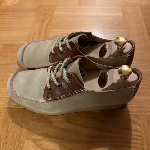 Loafers och seglarskor i storlek 39, beige färg och tillverkade i mockamaterial. Skorna har en låg profil och snörning framtill. Använda skick med synliga tecken på slitage, särskilt på insidan och sulan.